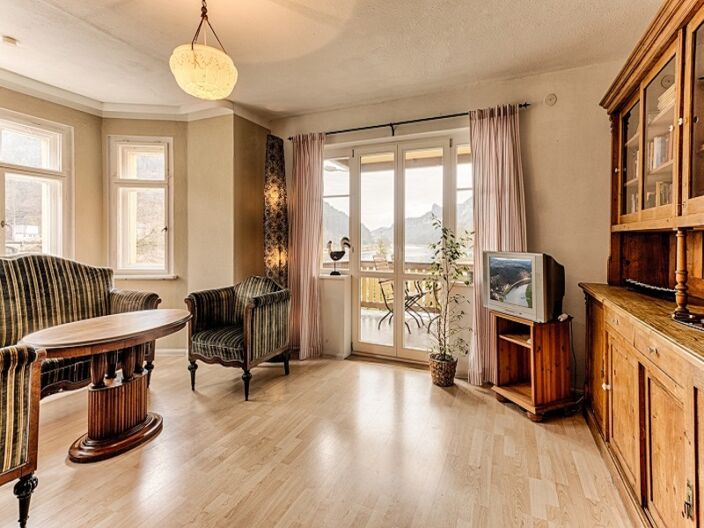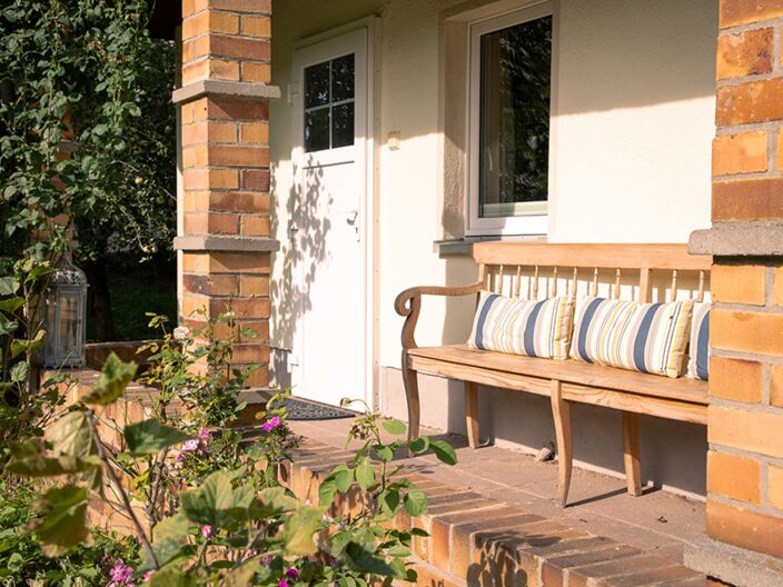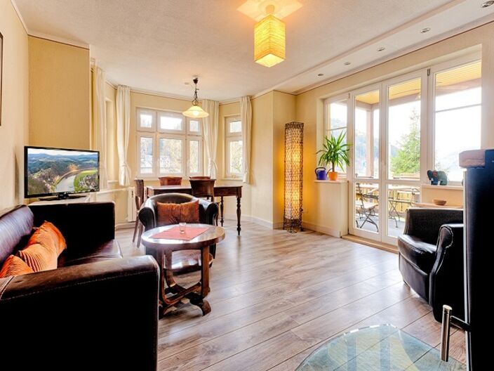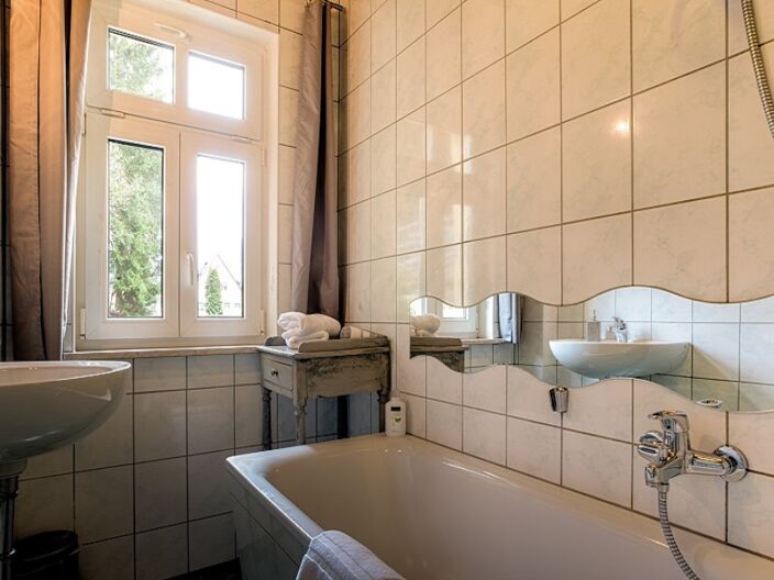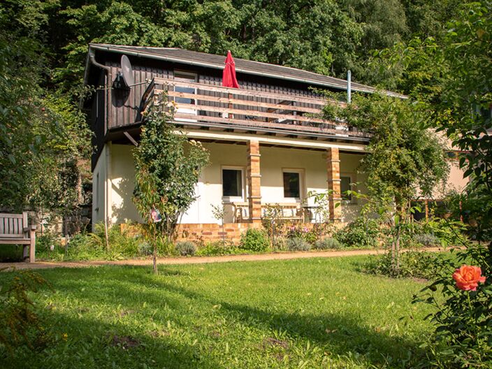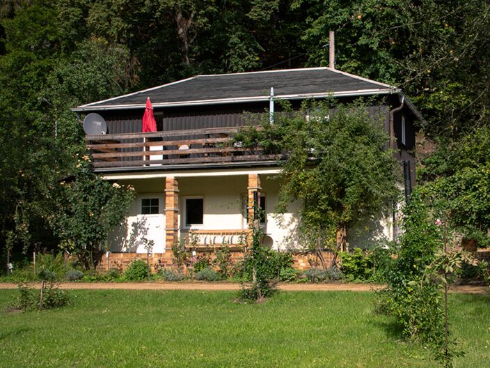 Die Villa aus den 30er Jahren des vorigen Jahrhunderts war einst das mondäne Wohnhaus des ehemaligen Bürgermeisters Arno Hohlfeld. Heute sind hier zwei Etagenwohnungen mit dem berühmten Dolomitenblick zu den Schrammsteinen. Das stilsichere Haus mit seinen ausladenden überdachten Balkonen und den traditionellen Fensterläden ist umfangreich möbliert mit voll ausgestatteten Küchen, sonnigem Wohnzimmer und separaten Schlafzimmern sowie eingebettet in einen Rosengarten mit Liegewiese und eigenem Elbestrand.